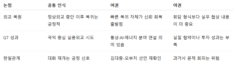 | ③ G7 이후 정무 효과 | 리더십 회복, 지지율 반등 가능성, 국정 주도력 확보 |